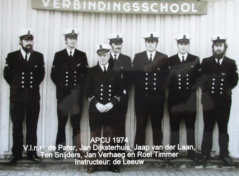 SGT opleiding SGT opleiding – 1969 Vlnr: Jan Vroege, Nico de Vries (†), Jan Bakker, Rob Hubertse, OPPTLG Gijs van Anrooij, Fred Drost (†) en Jan Bots. BZ SS19 – 1973SS staat voor sergeant seiner opleiding (bron: Henk Visser). V.l.n.r.: R.P.W. Wester, D.J. Hoevens, H. Visser en G.A. Koster.Uit bericht 210811z dec 73 van marinedenhaag:bij geen bedenkingen bevorderd miv 1 jan 74 tot SGTSNRT.Instructeur SMJRSNRT Henk Zeef (†). BZ APCU 1974 BZ APCU SNRT 1977 – okt t/m dec V.l.n.r.: Willem van Loo, Ad Pott, Henk Vrijhof, John den Ouden, instructeur SMJRSNRT Hunt, Henk van Ravenzwaaij. BZ